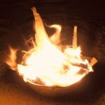 木々に囲まれた自然の中で、焚き火を囲みながら、